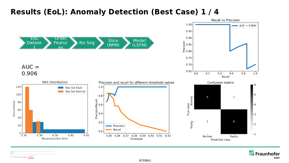 As part of a master thesis with Fraunhofer IDMT and Schaeffler AG, I developed Multilayer Perceptron and LSTM Autoencoder models for anomaly detection in Audi e-tron NVH data, achieving 82–90% accuracy. The project involved dimensionality reduction using T-SNE and clustering with DBSCAN for identifying patterns and faults. The goal was to detect gearbox anomalies using acoustic and structural vibration signals. This work demonstrated the effectiveness of machine learning in automotive fault diagnosis and R&D environments. [2]